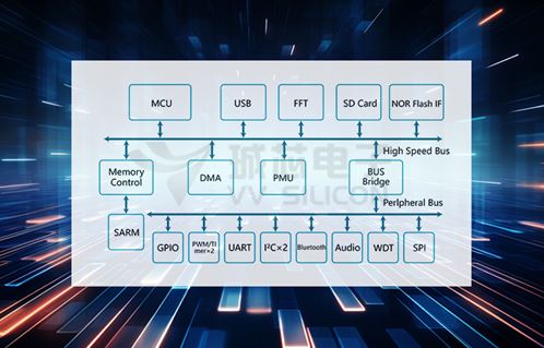 功能簡介 MCU通過高速總線控制USB、DMA、PMU等模塊,FFT用于信號處理,SD Card和NOR Flash存儲數據。內存控制器管理存儲器,GPIO連接外設。PWM/Timer2控制電機和LED亮度,UART和I2C進行通信,藍牙模塊支持無線通信,WDT監控系統狀態。